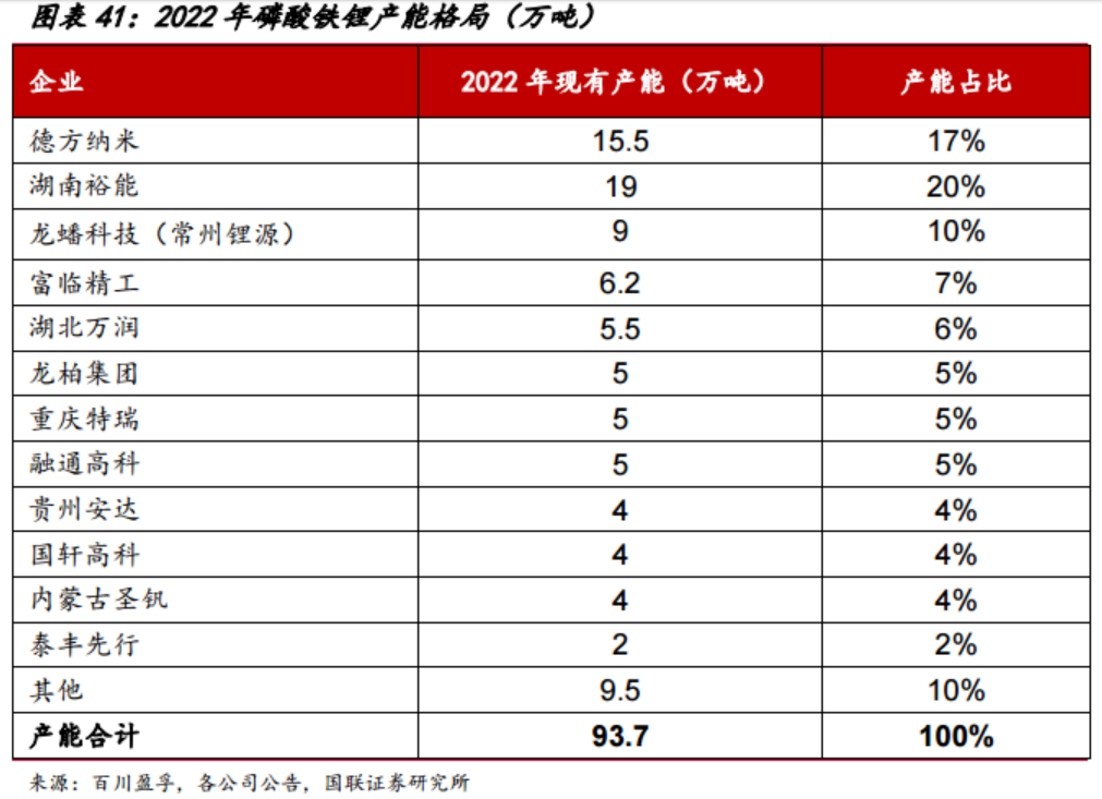 磷酸铁锂产能格局方面,2022年前五大企业分别为湖南裕能、德方纳米、常州锂源、江西升华(富临精工于2016年收购湖南升华)、湖北万润,合计产能51万吨,CR5为59%,其中湖南裕能拥有19万吨磷酸铁锂产能居行业首位,德方纳米产能15.5万吨居行业第二。