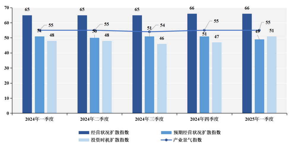 2025年第一季度,经营状况扩散指数维持在66,较上季度持平,继续位于荣枯线上方。