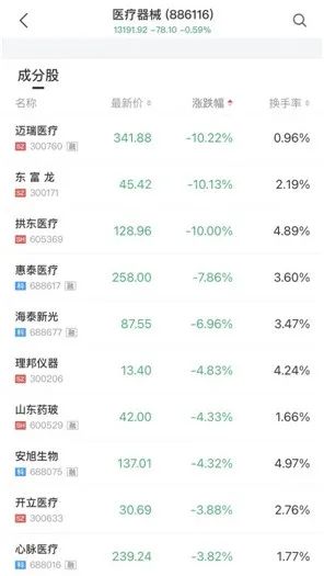 1月4日,A股医疗器械板块跌0.59%,其中,超4000亿市值的医疗器械白马股迈瑞医疗开盘大幅下挫,公司股价收跌超10%。在其带动下,东富龙也下跌超10%,拱东医疗跌停。
