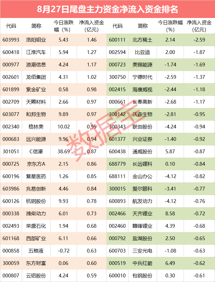 从个股尾盘资金流向数据看,有45股尾盘净流入资金超过3000万元,洛阳钼业、江淮汽车、浪潮信息等个股尾盘资金净流入金额最多,分别达1.46亿元、1.27亿元、1.17亿元;北方稀土、比亚迪、美锦能源等个股尾盘资金净流出金额居前,分别流出2.59亿元、1.87亿元、1.69亿元。