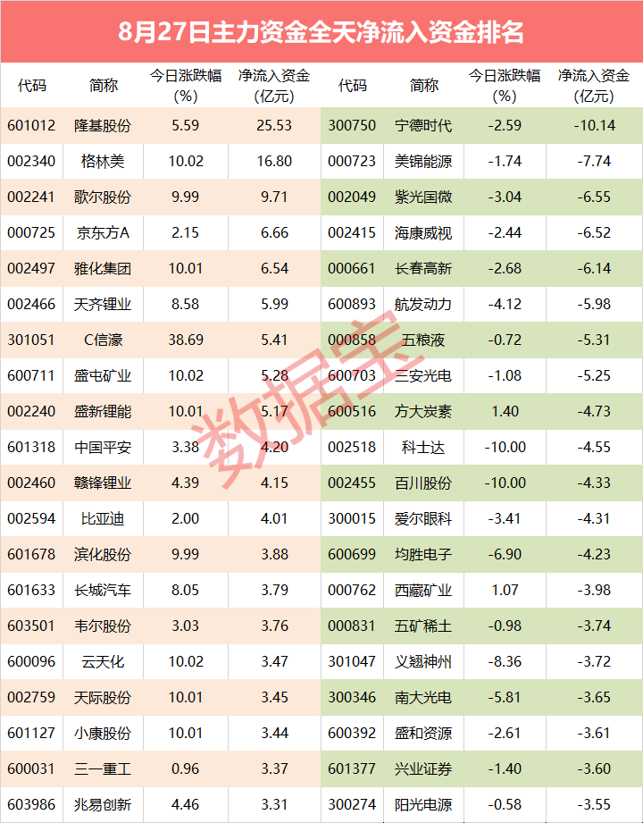 沪指8月27日涨0.59%,深证成指涨0.15%,主力资金全天净流出249.12亿元。其中,创业板主力资金净流出128.03亿元,沪深300成份股主力资金净流出470.91亿元。