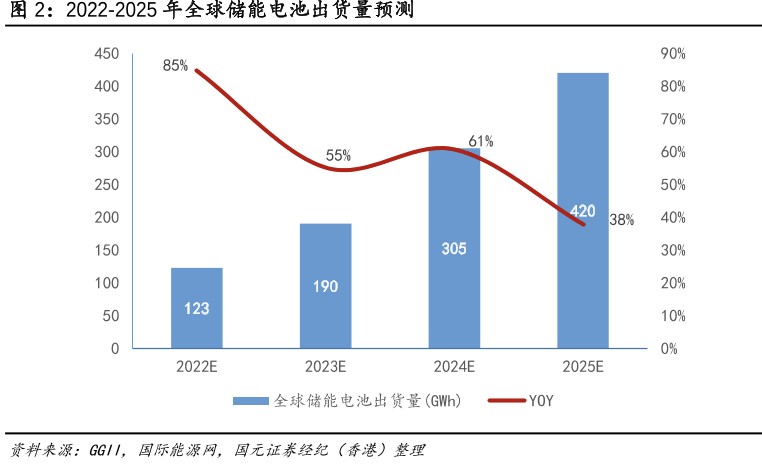 储能方面,国元证券预计全球储能电池2023/2024年出货量增速可达55%、61%,但由于占比偏小,对锂盐需求拉动远不及动力电池。