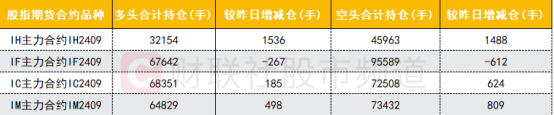 本周五6月份期指合约将进行移仓,今日开始本栏目统计的主力合约换成9月份主力合约(目前持仓数量最多的月份)。四大期指主力合约中,IH、IC、IM合约多空双方均加仓,IH合约多头加仓数量略多,IC、IM合约空头加仓数量较多;IF合约多空双方均减仓,空头减仓数量较多。