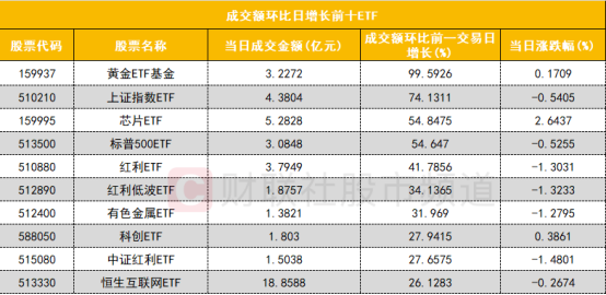 从成交额环比增长前十的ETF来看,黄金ETF(159937)成交额环比增长近一倍位居首位;芯片ETF(159995)成交额环比增长54%位居第三位。