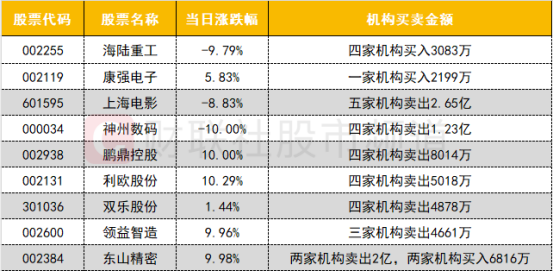 卖出方面,多只苹果概念股遭机构卖出,其中东山精密遭机构卖出2亿,鹏鼎控股遭机构卖出超8000万,领益智造遭机构卖出超4000万;其他个股方面,传媒股上海电影遭机构卖出2.65亿;鸿蒙概念股神州数码遭机构卖出1.23亿。