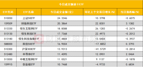 从成交额前十的ETF来看,上证50ETF(510300)成交额位居首位;纳指科技ETF(159509)成交额位居第二位;三只恒指相关ETF分居三到五位。