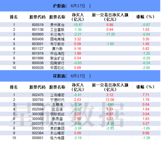 净卖出方面,贵州茅台净卖出居首,遭净卖出超10亿;比亚迪净卖出居次席,遭净卖出超5亿;两只家电股美的集团和格力电器均遭净卖出。