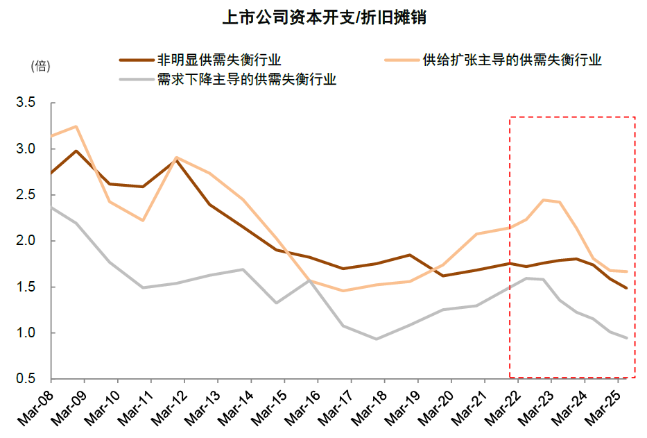 能源原材料:能源原材料中的细分行业周期位置差异较大,其中煤炭开采行业2022-2024年资本开支增长141%且今年上半年继续扩张48%,但与此同时需求相对偏弱,逐渐步入了阶段一的供需失衡状态。近期市场交易基础化工行业的产能出清和政策“反内卷”,但是结合资本开支/折旧摊销等指标仍然较高,化工的子行业板块仍处于阶段三,尚未实现产能充分出清,但产能投放高峰已过,行业供需失衡的压力相比过去缓解。钢铁、水泥和玻璃玻纤虽然供给端指标显示行业明显收缩,但考虑到房地产投资下滑对需求影响较大,同样无法基于供给端数据判断行业已实现出清。相较而言,看好工业金属和小金属,无论是结合财务指标还是全球实际供需状态,都处于产能出清状态,且需求端受益AI和全球地缘环境带来的新需求,是能源原材料里面首选的细分行业。油服工程长期处于资本开支/折旧摊销低于1的出清状态,但需求改善不明显,因而作为备选关注行业。(图表3)