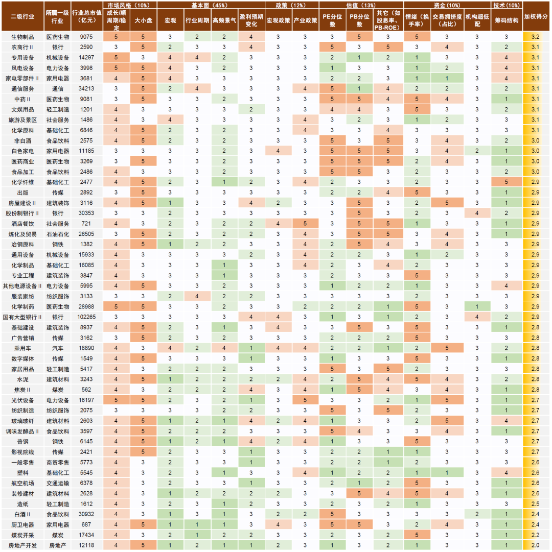 以行业多因素筛选考虑较为全面。行业配置多因素筛选也是主流的配置做法之一,优点在于考虑因素全面,并且能避免主观随意性,但难点在于不同阶段市场主要矛盾常发生变化,不同因素的权重需要基于市场变化进行调整,以及部分基本面指标的判断也难以完全避免主观性。本次报告中尝试在此前五因素打分模型的基础上,对于细分行业,分析指标进行初步优化,结果如(图表14、15)所示。其中当前对于风格、基本面、政策、估值、资金面和技术的权重分别为10%、45%、12%、13%、10%、10%,如果市场风险偏好下降,则估值、资金面和技术的权重可能上升,反之则下调权重。具体指标解释如下:1)风格,主要基于自上而下对大/小盘、成长/顺周期/稳定风格判断,以及对行业所属风格界定进行赋分;2)基本面,其中有自上而下从消费、出口、投资、全球等因素判断宏观环境与行业的关联,也有自下而上从行业周期位置、高频景气数据跟踪和盈利预期调整进行赋分,其中行业周期位置与前述产能周期高度结合,是权重最高项目;3)政策,主要结合货币、财政等宏观政策关联性,以及具体产业政策支持程度横向比较赋分;4)估值,主要包括ROE与PB分位数之差,PB和PE分位数,估值性价比越高则赋分越高;5)资金面,主要结合行业的情绪指标、拥挤度和机构超低配情况赋分,情绪和拥挤度适度高或者极度冷相对赋分较高,情绪和拥挤度过高则赋分低;6)技术,主要根据筹码分布,估算各行业指数和成本曲线的相对位置对于A股指数成本曲线估算和运用),其中最优筹码结构为成本曲线由短周期至长周期多头排列,且指数与成本偏离度没有过大。例如当前工程机械资金筹码结构较好,并且板块涨幅不大,与成本线偏离度较低,是最优情形;而通信设备虽然也呈现多头排列,但是指数与不同期限成本偏离过大,得分相对较低;股份制银行则是由于近两个月调整,短期成本曲线已经下穿长期成本曲线,资金筹码结构相对不佳,技术得分最低(图表16)。