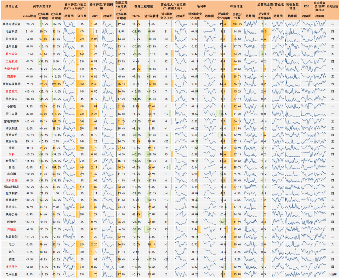 传统制造&非制造业:传统制造和非制造业领域中有较多行业削减资本开支并在低位维持较长时间,但相较高端制造而言需求偏弱,因此对于出清的认定标准更高,而且在市场风险偏好较高阶段,股价弹性也相对较弱。其中航海装备和摩托车行业过去两年开启新的资本开支扩张周期,在市场表现层面已有较大涨幅,未来需求侧的持续增长较为重要。之前实现出清,处于阶段五的右侧行业主要包括轨交设备、光学光电子和商用车,但目前而言整体需求改善和资本开支扩张幅度较为有限。处于供给出清但需求尚未改善的阶段四的行业,资本开支/折旧摊销普遍在1倍左右或以下维持较长时间,主要包括工程机械、白色家电、养殖业、饲料、饮料乳品和通信服务等。其中值得关注的是,本次中报新入选的工程机械、养殖业和饲料,工程机械过去3年大幅缩减资本开支,需求端出海取得突破性进展,抵消了一部分国内销量的下滑,而当前由于更新周期的临近,国内销量也出现企稳迹象;养殖业和饲料同样经历4年去产能的周期,在建工程已大幅减少,而且“反内卷”政策在养殖业的可行性和优先级相对较高,龙头公司拥有突出的成本优势,当前也有较好配置性价比(图表5)。