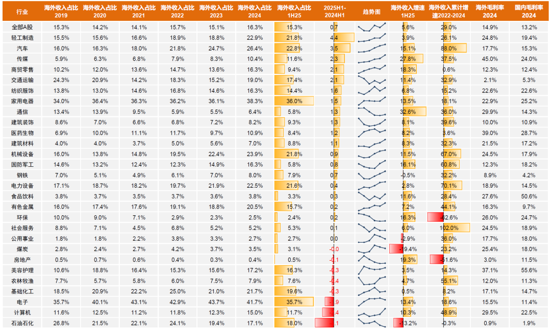 出海仍然是当前业绩确定性较好的机会。过去几年国内有效需求相对不足的背景下,上市企业国内业务增速整体放缓,企业通过产品出口或产能出海获得新的增长驱动力。尽管全球产业链在发生重构,贸易不确定性上升,但中国制造业的全球竞争力也同步提升。受益于新兴国家和发展中国家工业化进程,中国对非美经济体出口增速较高,行业层面体现为机电类等中间品增速较高。上市公司海外业务收入占比普遍提升,全部非金融企业由2021年14.1%的占比提升至2024年的16.3%,1H25全部A股上市公司海外收入同比增速5.6%,占比进一步提升,一定程度上弥补了内需的相对不足。分行业来看,家用电器、电子等行业保持了出口竞争优势,2024年海外收入占比分别达38.3%和41.7%。而机械设备和汽车则是海外收入占比提升幅度最大的行业,2024年相比2021年分别提升9.0和8.4个百分点,反映中国拥有超大规模市场、大长全的产业链和人才红利等优势,制造业竞争力不断扩展到新的领域。