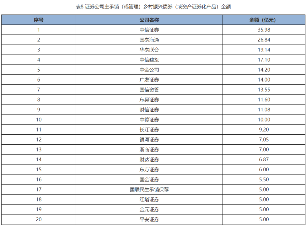 以金额计,国泰海通和国新证券以10亿元同时位列首位,财信证券、西部证券、平安证券位居第三至第五。