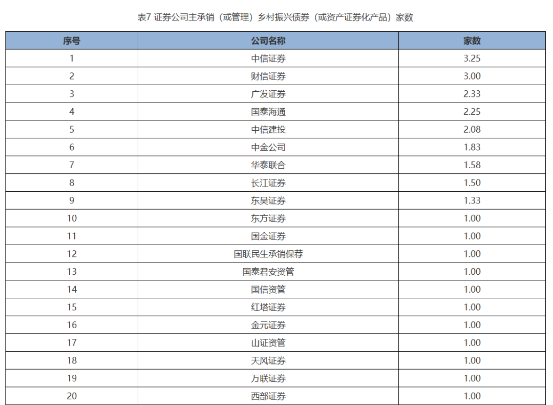 乡村振兴债券(或产品)数量和金额同比大幅拉升。数据显示,2025年上半年度作为乡村振兴债券主承销商(或资产证券化产品管理人)的证券公司共30家;承销(或管理)37只债券(或产品),同比增加164.29%;合计金额266.24亿元,同比增加134.32%。