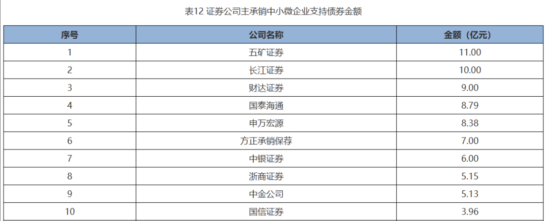 值得关注的是,中证协此次发布的券商债券承销业务专项统计共包含八类。相比于以往,本次结果还增加了对中小微企业支持债券的统计。
