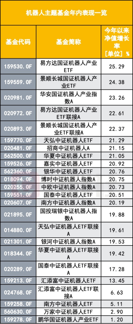 具体来看,截至目前,全市场共有24只机器人主题基金(基金名称中包含“机器人”),均为ETF以及指数型基金,年内净值全数上涨,其中上述提到近期净流入最多的易方达国证机器人产业ETF今年以来上涨25.29%,景顺长城国证机器人产业ETF紧随其后,净值上涨24.38%。还有华安国证机器人产业指数、易方达国证机器人产业ETF联接等12只产品净值上涨超过20%。
