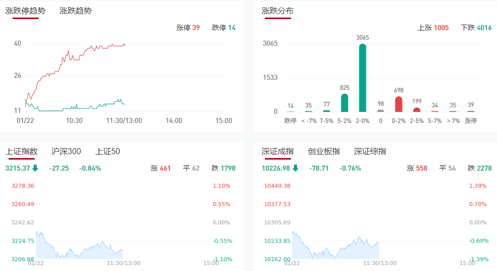 市场早盘低开低走,沪指领跌。沪深两市半日成交额7340亿,较上个交易日缩量417亿。盘面上热点集中在AI硬件方向,除此外其余个股普跌,全市场超4200只个股下跌。从板块来看,算力概念股全线走强,铜缆、CPO等方向领涨,广合科技等多股涨停。机器人概念股走势分化,金奥博等涨停。下跌方面,小红书概念股持续调整,汇洲智能跌停。