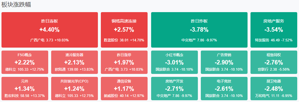 板块方面,铜缆高速连接、液冷服务器、CPO、PCB概念等板块涨幅居前,小红书概念、房地产、游戏、旅游等板块跌幅居前。截至收盘,沪指跌0.84%,深成指跌0.76%,创业板指跌0.58%。