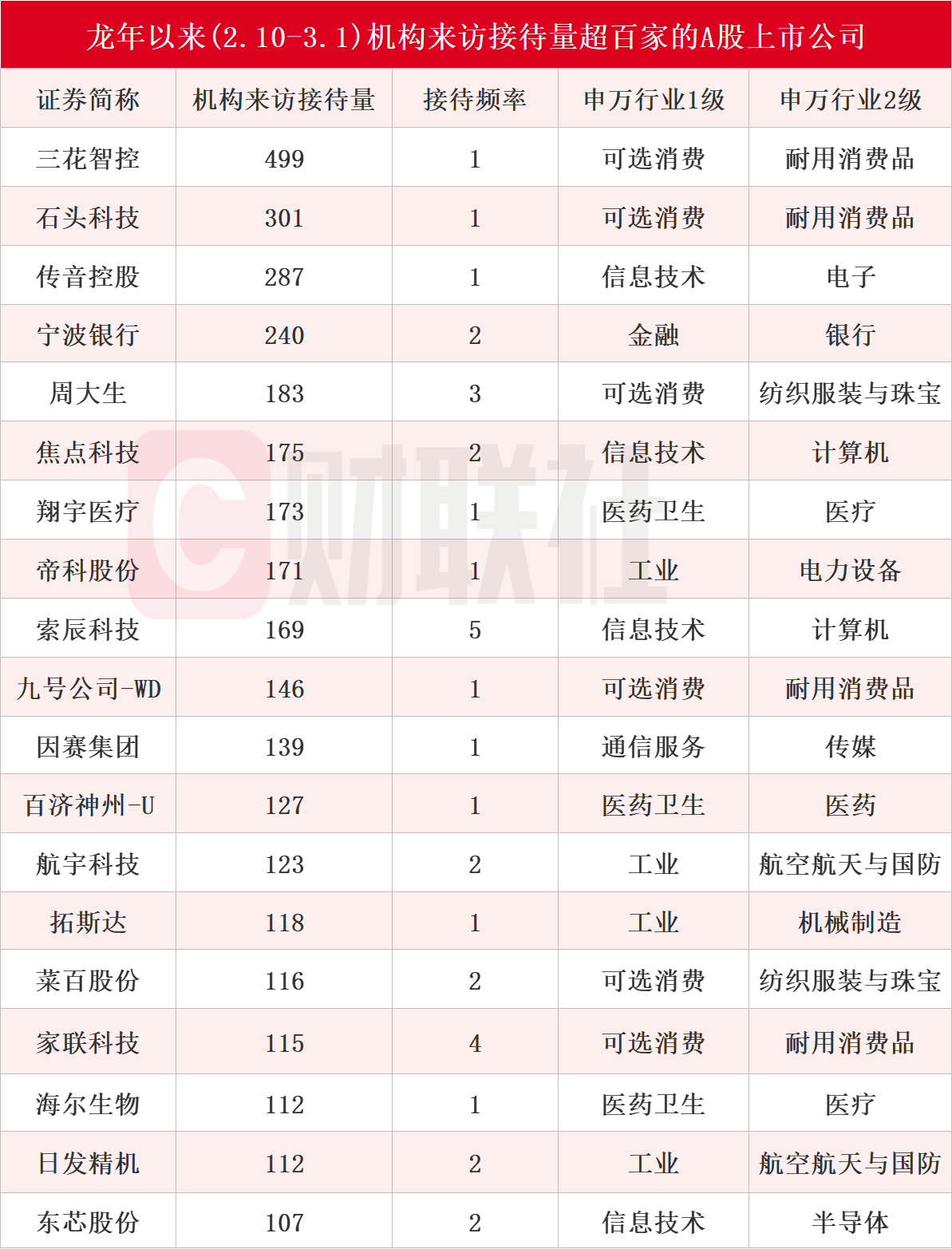 据Choice数据显示,龙年以来包括三花智控、石头科技、传音控股、宁波银行、周大生、焦点科技、翔宇医疗、帝科股份、索辰科技、九号公司、因赛集团、百济神州、航宇科技、拓斯达、菜百股份、家联科技、海尔生物、日发精机和东芯股份在内的19家上市公司机构来访接待量超100家,具体情况见下图: