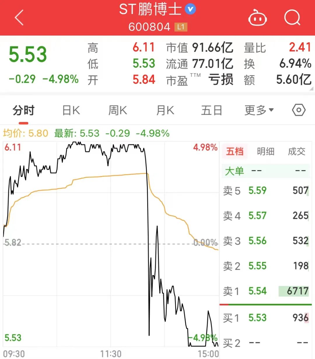 今日早盘,ST鹏博士平开后连续拉升,盘中多次触及涨停板。下午13点35分左右,股价急速跳水,7分钟内跌幅达到8.7%;随后持续震荡至跌停,收盘前有资金一度撬开跌停板,最终仍以跌停收盘。
