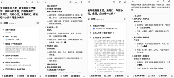 记者输入下述症状:“积食且受寒,腹泻,发烧38.5度,手脚冷热交替,四肢酸疼无力,食欲差,舌苔黄腻,数脉,气短心慌,应该吃什么药?尽量中成药。”参考腾讯混元大模型和DeepSeek-R1的回答,记者先后服用藿香正气口服液、布洛芬、蒙脱石散、健胃消食片,两日后退烧,退烧后继续服用参苓白术丸、健胃消食片、补中益气丸、四君子颗粒和黄芪生脉饮,再一日后气短虚弱状况消失。