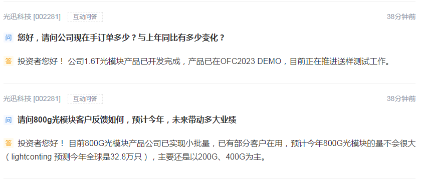 5月19日,光迅科技在深交所互动易平台表示,目前800G光模块产品公司已实现小批量,已有部分客户在用,预计今年800G光模块的量不会很大(lightconting预测今年全球是32.8万只),主要还是以200G、400G为主。