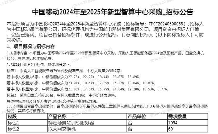此前,中国移动还发布了2023-2024年新型智算中心(试验网)集采项目,12个标包对应AI训练服务器采购量总计达到2454台(1-11标包集采1204台,12标包集采1250台)。两次人工智能服务器集采规模合计超过万台。