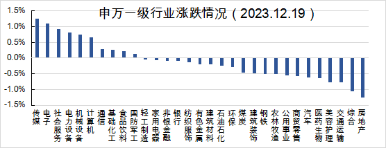 12月19日A股多数行业下跌,房地产、综合、交通运输等行业领跌,而传媒、电子等成长行业以及社会服务、电力设备等行业均上涨。其中,房地产、建筑材料、食品饮料等行业的底背离信号仍然存在,但底背离现象能否被证实尚需观察。而传媒行业本日大幅上涨1.24%,但顶背离信号仍接近被证实。