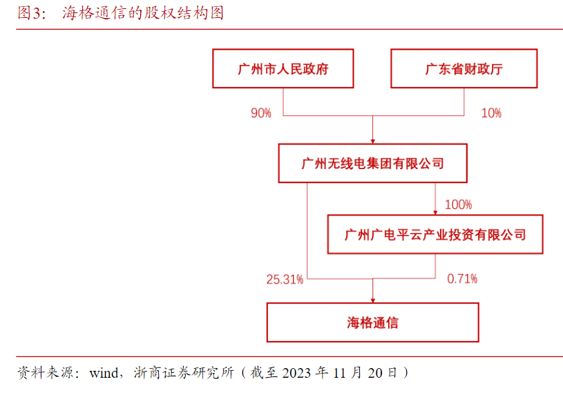 公司第一大股东广州无线电集团持股26.02%,背靠广州市政府。广州无线电集团为100%国有企业,广州市人民政府拥有其90%股权,广东省财政厅拥有10%,广州无线电集团主要布局智能金融、智能交通、智能安全、智能便民、无线通信、北斗导航、航空航天等领域。其中海格通信主要承载了无线通信、北斗导航、航空航天领域的相关业务。