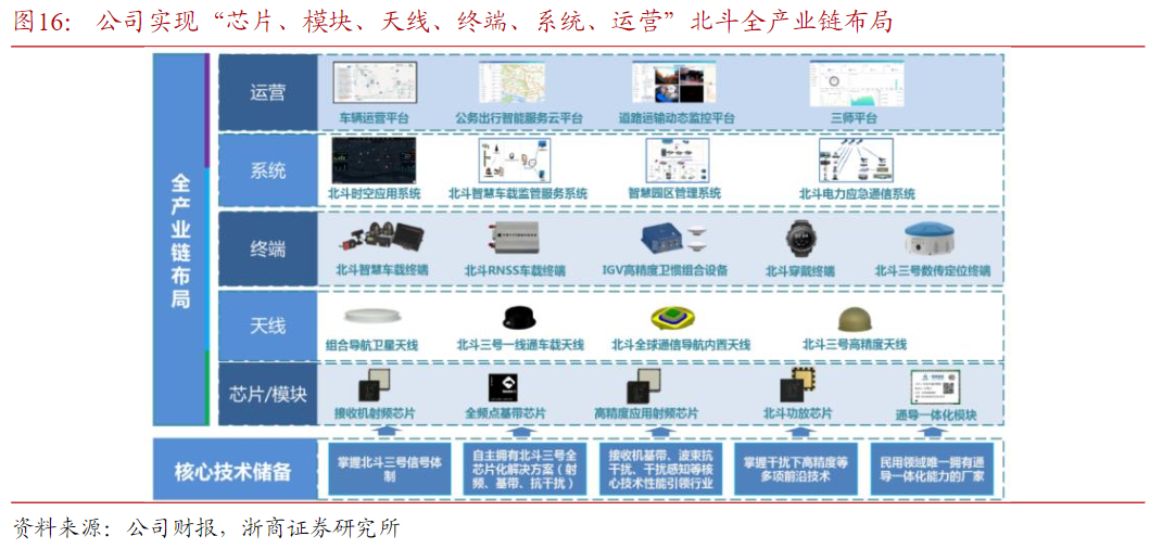 公司基于核心芯片的底层技术,实现“芯片、模块、天线、终端、系统、运营”北斗全产业链布局。在芯片端自主研发了接收机射频芯片、全频点基带芯片、高精度应用芯片、北斗功放芯片、通导一体化模块等核心芯片和模块。基于北斗核心芯片的底层技术,海格向上延申形成了“芯片、模块、天线、终端、系统、运营”的北斗全产业链。