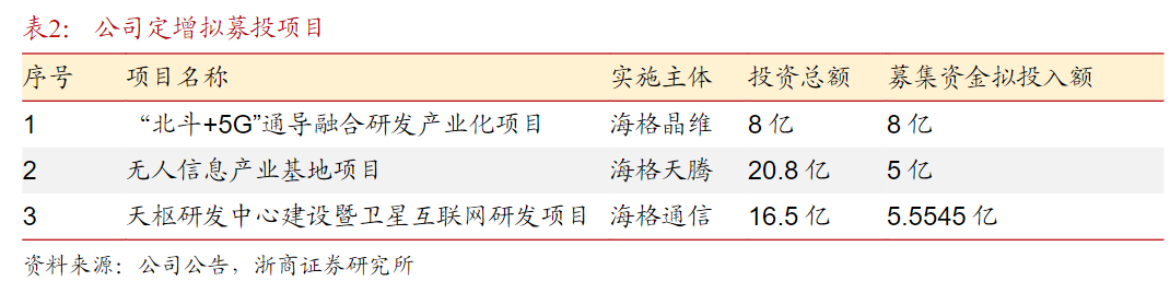 公司定增引入产业链投资者,蓄力新成长。公司于23年6月发布定增公告,本次定增发行价格为10.46元/股,发行股数1.77亿股,募集资金总额18.55亿元,拟募集18.56亿资金用于三大项目,赋能北斗导航、北斗、卫星互联网、军工领域、广州产投私募基金等。