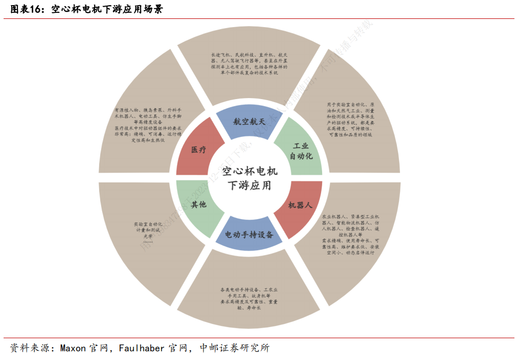 下游应用需求端,空心杯电机应用场景广泛,目前已经在医疗领域内如仿生义肢、外科手术机器人等场景发挥着重要作用,同时也应用在对于重量、寿命要求较高,性能转速要求较低的电动工具场景,以及精度、可靠性、控制要求极高的航空航天、工业自动化、测量、光学等场景。