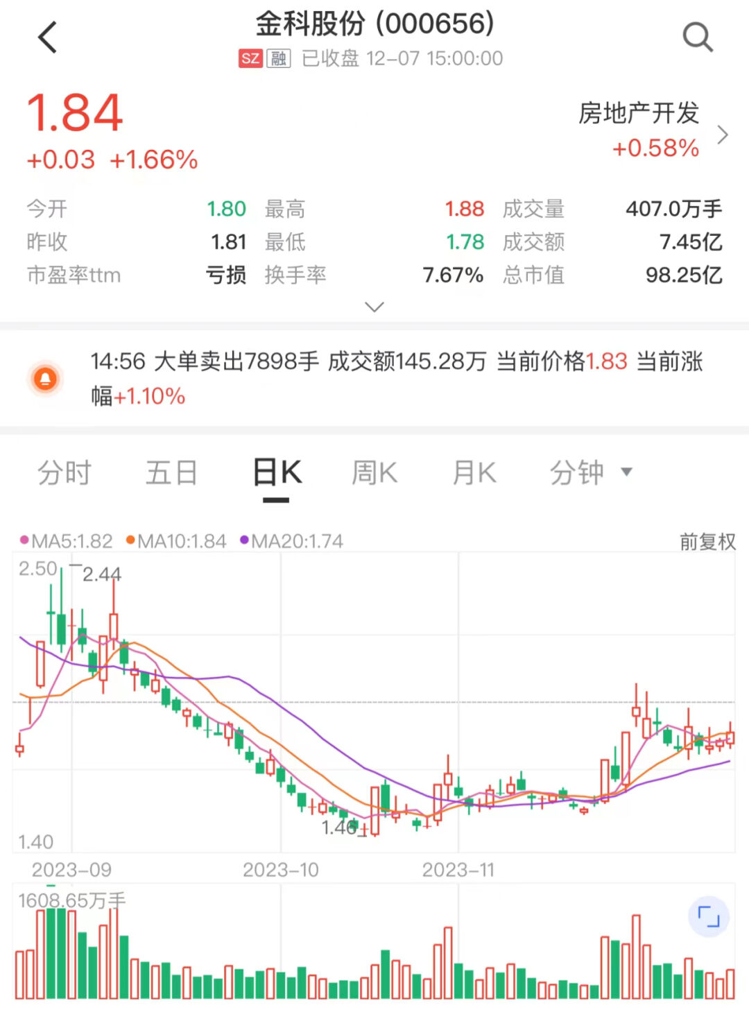 Wind数据显示,截至12月7日收盘,金科股份股价收报1.84元/股,总市值98.25亿元。