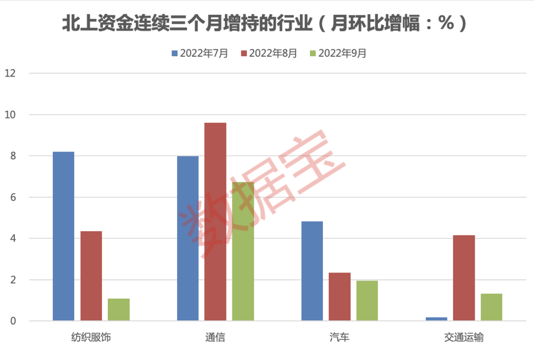 数据宝统计,从增持的连续性上来看,有四个行业获北上资金连续三个月加仓,除通信行业外,汽车、交通运输、纺织服饰均获北上资金连续净流入。连续三个月减仓的行业仅有三个,包括社会服务、建筑材料、家用电器;其中社会服务行业主要受疫情反复影响,建筑材料受到高温停电停产影响较大,供给相对收缩。