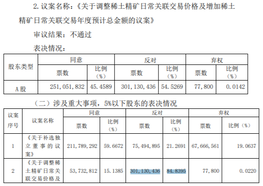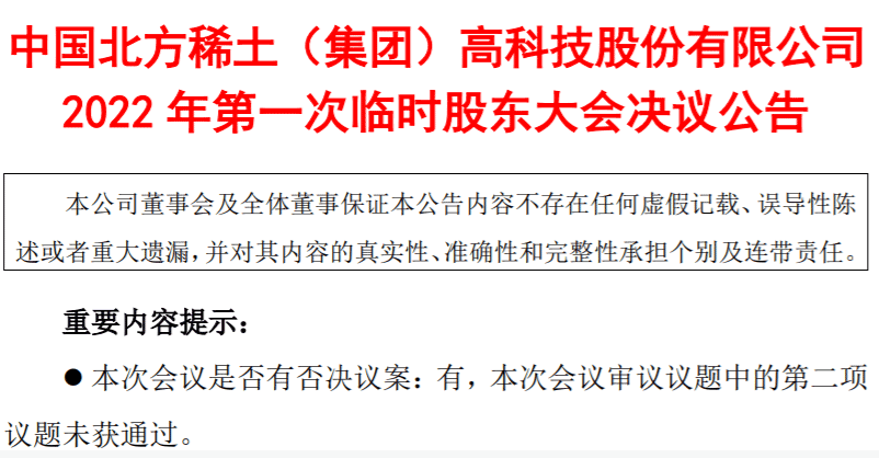 7月15日,北方稀土召开2022年第一次临时股东大会,审议《关于调整稀土精矿日常关联交易价格及增加稀土精矿日常关联交易年度预计总金额的议案》(下称“《关联交易议案》”)未获通过。