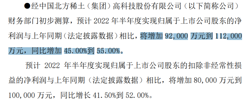 7月12日,北方稀土公告称,预计2022年上半年归母净利润同比增加9.2亿元至11.2亿元,同比增长45%至55%。