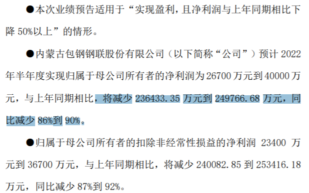 7月15日,包钢股份公告称,预计2022年上半年归母净利润同比减少236433.35万元至249766.68万元,同比下降86%至90%,主要是2022年第一季度受原燃料价格上涨影响,导致公司盈利水平明显下降,4月末钢价快速下跌以及上游原燃料价格高位运行,公司主要钢铁产品成本上升,毛利率下降。