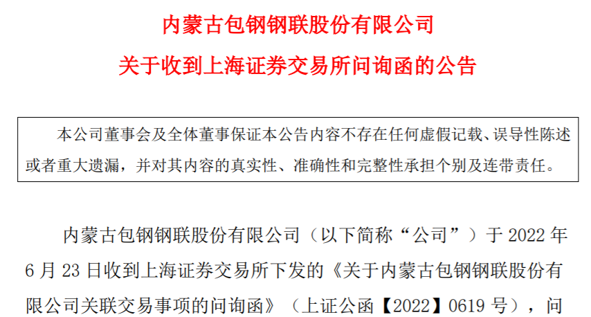 上交所在问询函中提及,近期,北方稀土股价持续下跌;6月22日,包钢股份在盘中涨停至收盘。