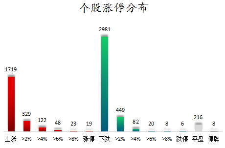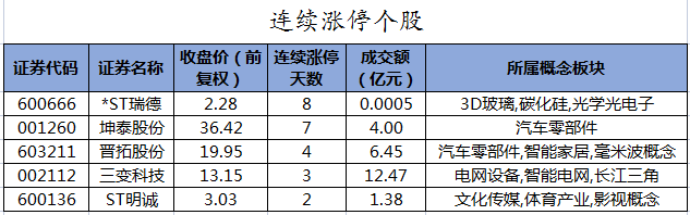 截至收盘,沪深两市合计1719只个股上涨,2981只个股下跌,平盘个股216只,停牌的个股8只。不含当日上市新股,共有19只个股涨停,6只个股跌停。连续涨停天数看,*ST瑞德已连收8个涨停板,连续涨停板数量最多。