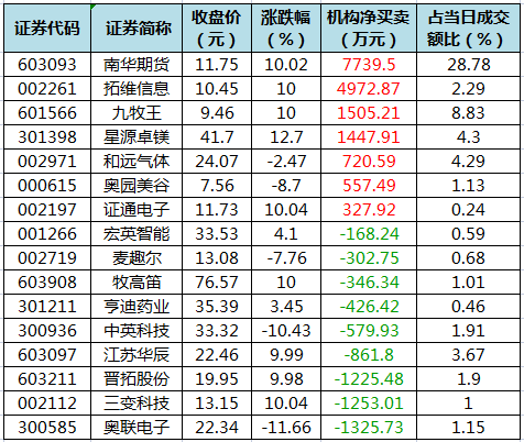 盘后龙虎榜数据显示,今日机构席位资金合计净买入约1.08亿元。其中,净买入的个股7只,净卖出的个股9只。机构净买入最多的股票是南华期货,净买入金额约7739.5万元;机构净买入居前的还有拓维信息、九牧王等股。机构净卖出最多的股票是奥联电子,净卖出金额约1325.73万元;机构净卖出居前的还有三变科技、晋拓股份、江苏华辰等股。