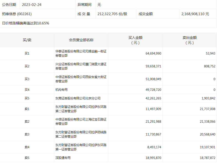 拓维信息今天涨停。盘后数据显示,1个机构出现在龙虎榜单上,净买入约4972.87万元;华泰证券股份有限公司无锡金融一街证券营业部买入6469.5万元,同时卖出5.39万元;中信证券股份有限公司上海红宝石路证券营业部买入2129.2万元,同时卖出2133.81万元。