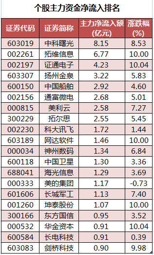 个股来看,今日有1569只个股获主力资金净流入,其中,16股获主力资金净流入超1亿元。中科曙光获主力资金净流入最多,净流入金额为8.15亿元;主力资金净流入居前的个股还有拓维信息、证通电子、扬州金泉、中国船舶、通富微电,净流入金额分别为6.77亿元、4.23亿元、3.22亿元、2.92亿元、2.68亿元。