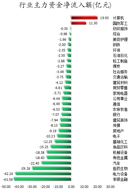 从行业板块来看,申万所属的31个一级行业,今日仅有计算机、国防军工2个行业板块主力资金呈现净流入,净流入金额分别为19.93亿元、11.3亿元。29个行业板块主力资金呈现净流出,其中,非银金融行业板块主力资金净流出最多,净流出金额为43.59亿元;行业板块主力资金净流出靠前的还有电力设备、医药生物、汽车、有色金属、机械设备,净流出金额分别为42.24亿元、29.26亿元、22.4亿元、18.4亿元、18.38亿元。