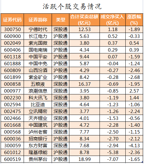 活跃个股方面,北向资金今日净买入的有宁德时代、长江电力、紫光国微、国电南瑞、中国平安,净买入金额分别为1.18亿元、0.52亿元、0.37亿元、0.29亿元、0.07亿元。北向资金净卖出较多的有贵州茅台、隆基绿能、东方财富、招商银行、泸州老窖,净卖出金额分别为7.07亿元、5.38亿元、2.94亿元、2.7亿元、2.5亿元。