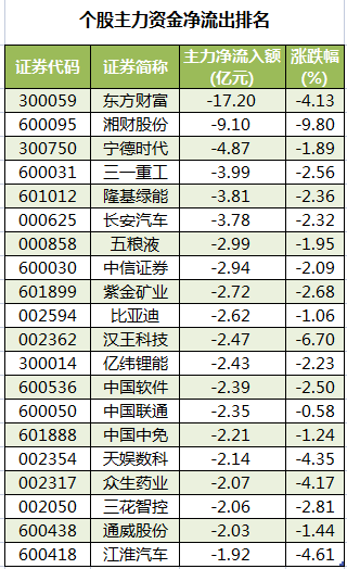 此外,3337只个股被主力资金净卖出,其中,57股被主力资金净卖出超1亿元。主力资金净流出最多的个股是东方财富,净流出金额为17.2亿元;主力资金净流出居前的个股还有湘财股份、宁德时代、三一重工、隆基绿能、长安汽车,净流出金额分别为9.1亿元、4.87亿元、3.99亿元、3.81亿元、3.78亿元。