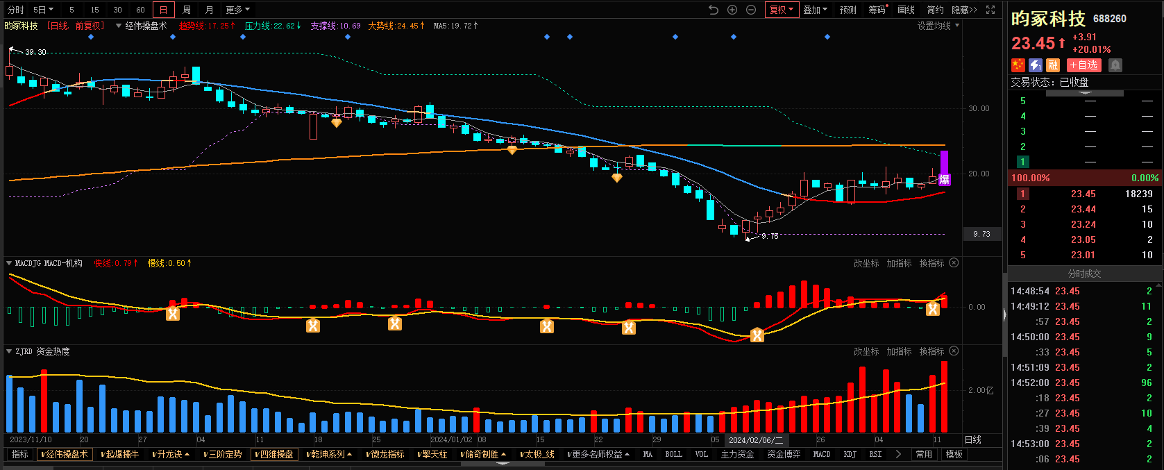 3)参考技术指标:昀冢科技-经伟操盘术指标-出现爆点信号