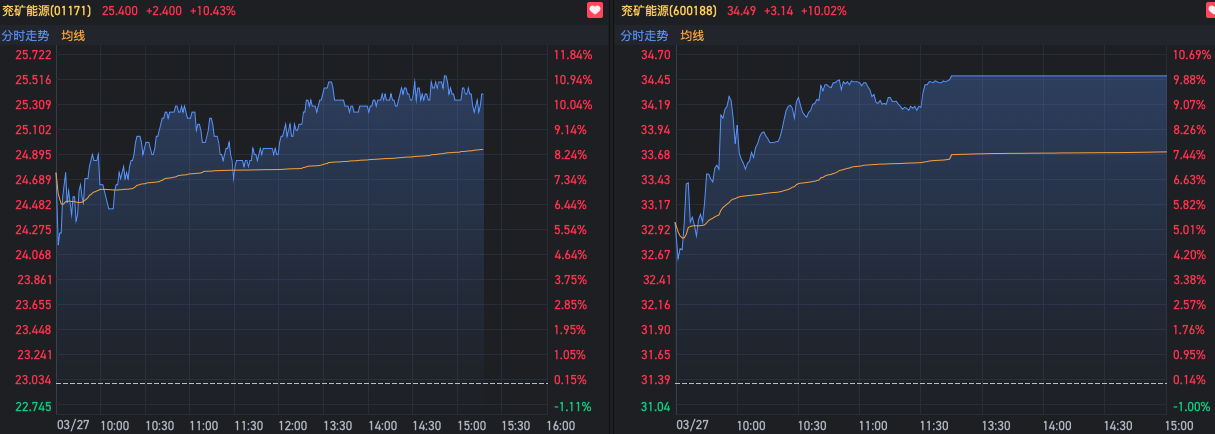 兖矿能源(01171.HK;600188.SH)AH股今日开盘后一路走高,截至发稿,兖矿能源H股涨10.43%,报25.4港元,成交14亿港元;兖矿能源A股涨停,报34.49元人民币,成交25亿人民币。