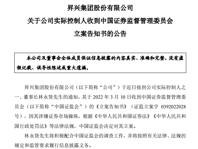 3月11日晚间,昇兴股份在深交所发布公告称,公司于近日接到实际控制人之一、董事长林永贤的通知,其于3月10日收到证监会的《立案告知书》,因其涉嫌证券市场操纵,中国证监会决定对其立案。