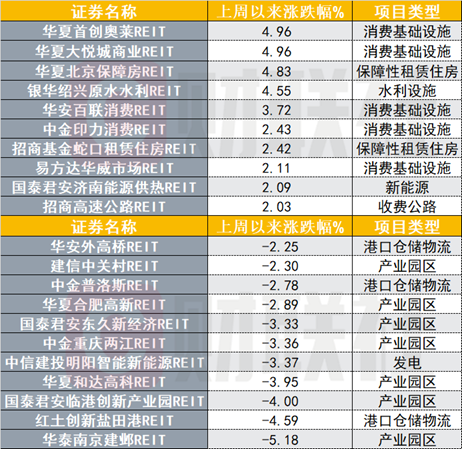 图:上周以来涨幅居前和跌幅居前的REITs项目