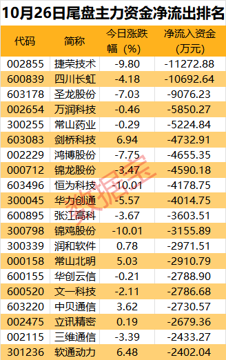 捷荣技术、四川长虹尾盘净流出资金超亿元。捷荣技术是前期大牛股,9月以来股价一度涨幅超4倍。今日大幅震荡,全天一度“天地板”,振幅达到20%。