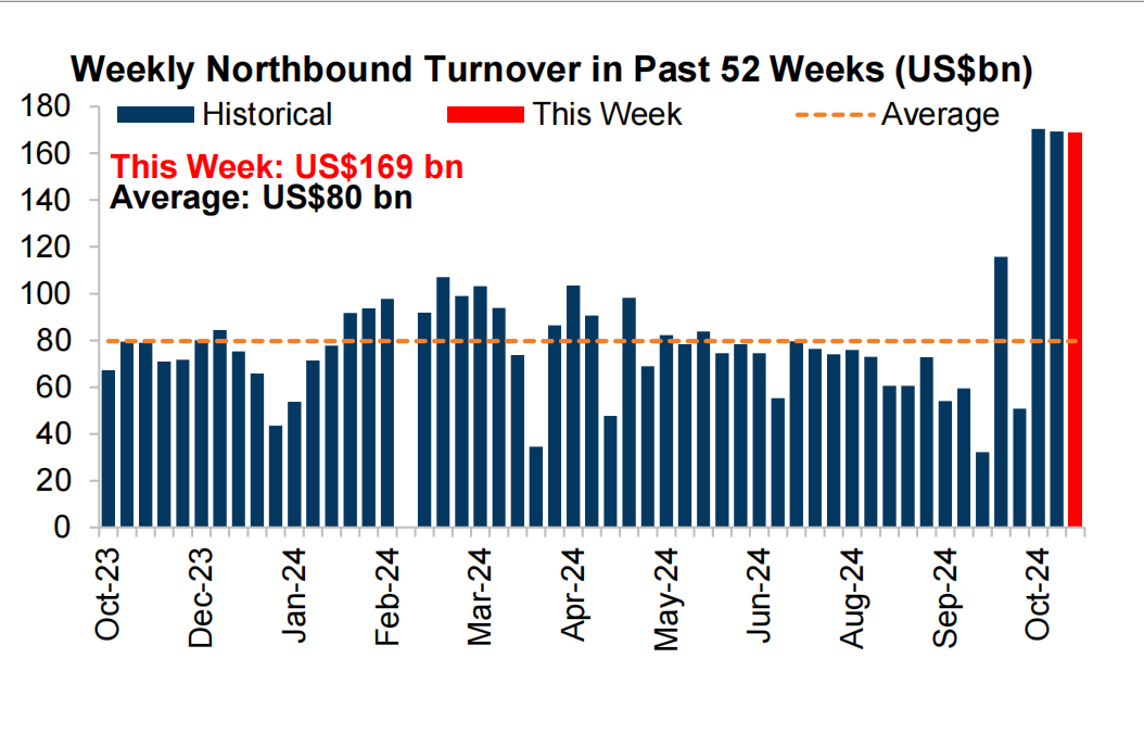 尽管当前已经不披露实时的北向资金净流入量,但成交量本身就可体现市场热度。数据显示,在过去三周,每周北向资金成交量都超过1500亿美元,过去一周为1690亿美元,远超800亿美元的均值水平。